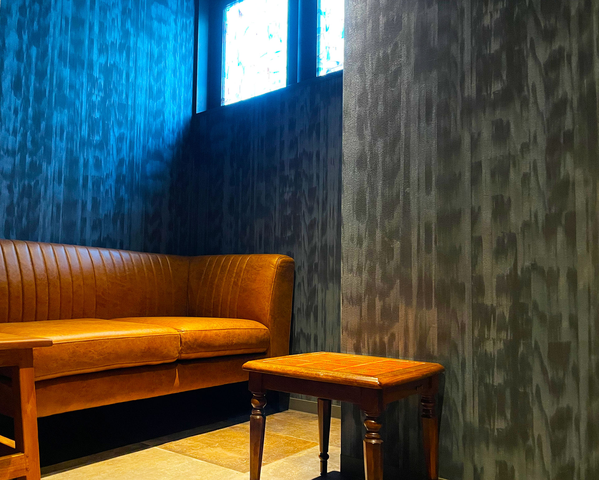 何の変哲もない普通の窓が、ステンドグラス加工されています。 普通の窓では、BARの雰囲気が出ませんよね。 この窓のある場所は、いい雰囲気の小部屋に変身します!