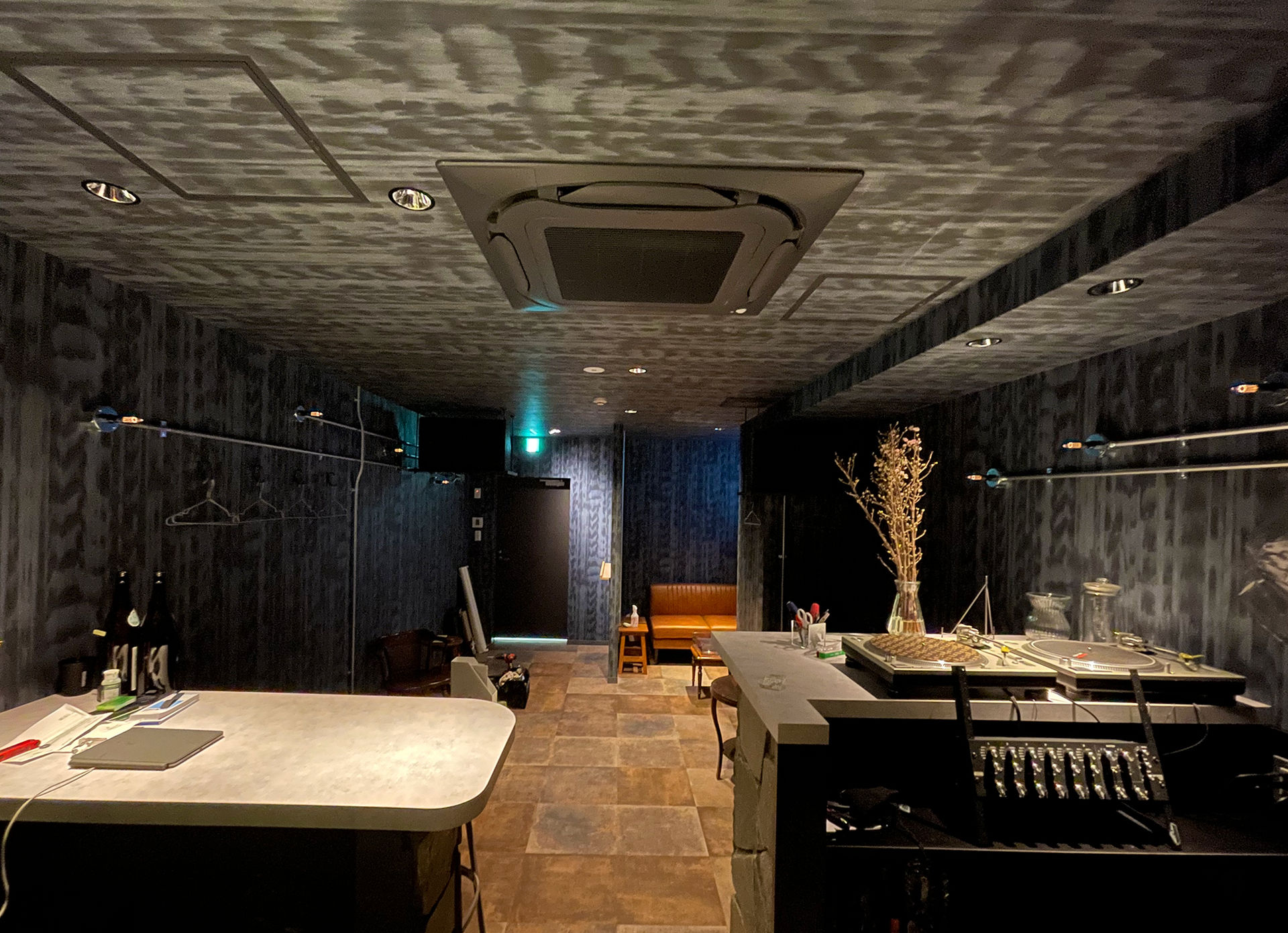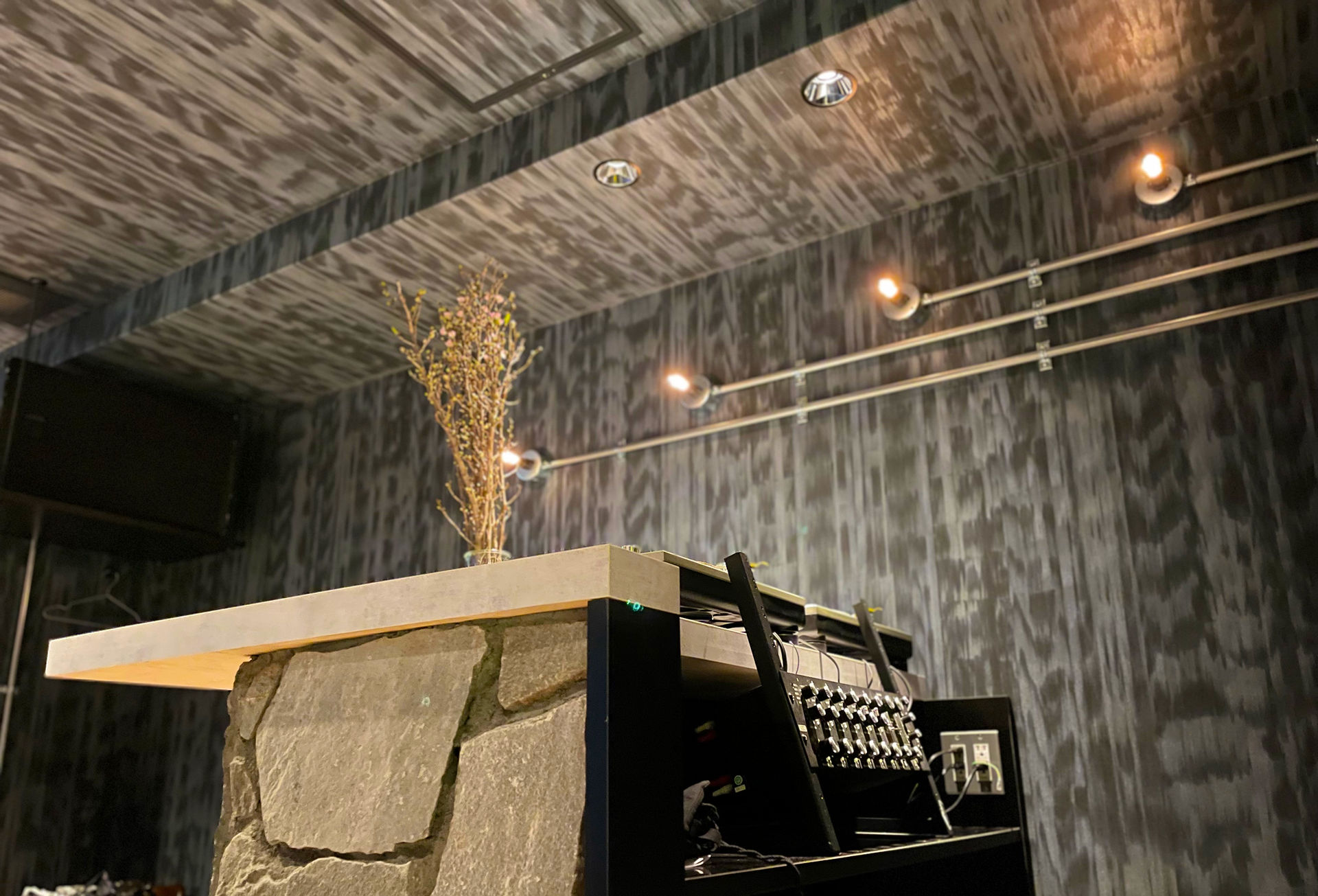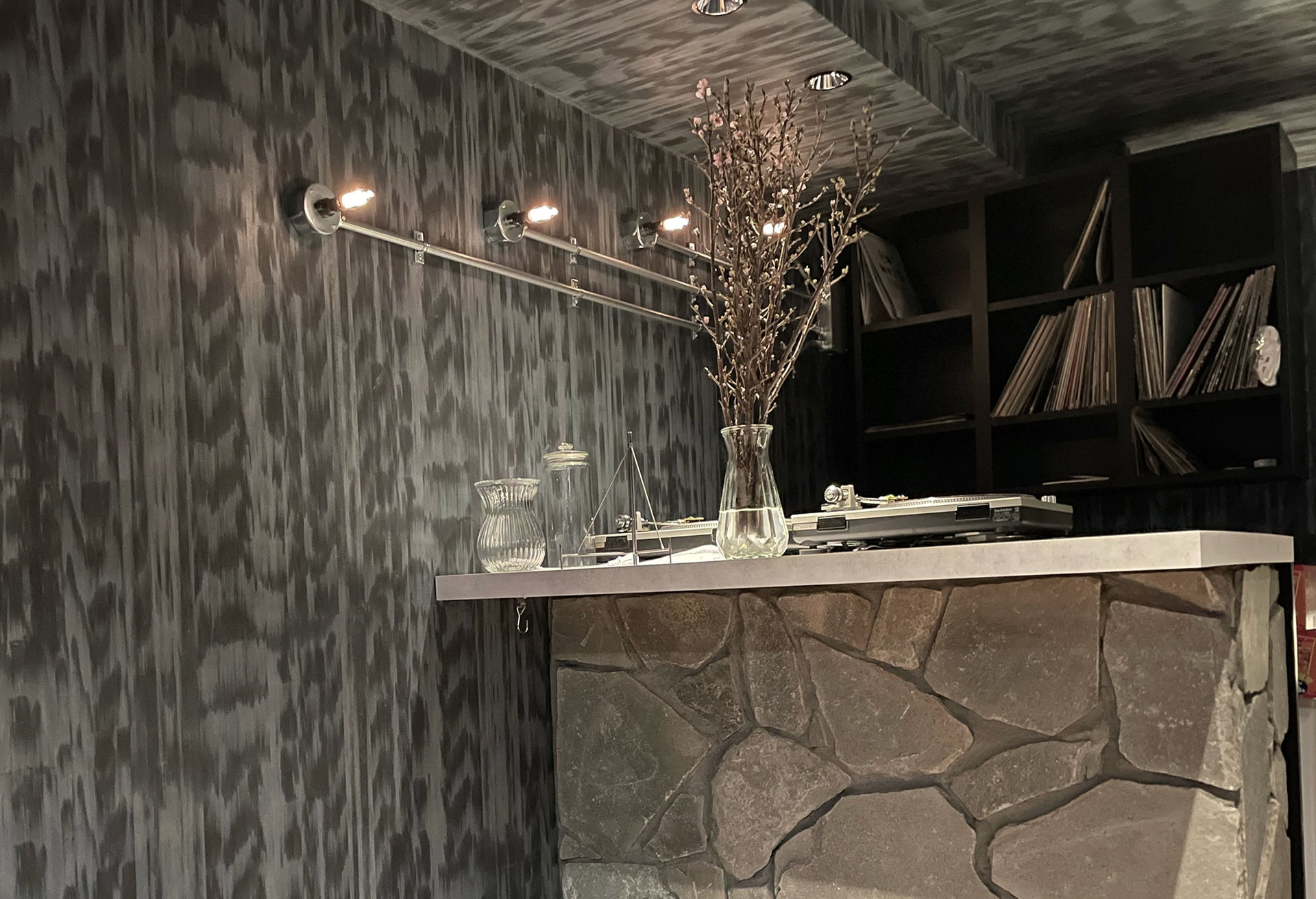 クロスを貼るだけで、だいぶ印象が変わりますね。BARの雰囲気が出てきています。 クロスの色柄って重要ですね! 壁面のパイプは何でしょうか?何かの装置?オブジェ? カッコイイのは確か。