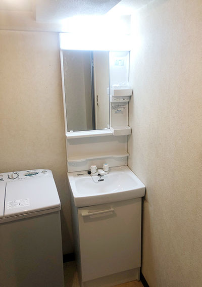【施工中】 普通に生活している中で、洗面台が外された状態はあまり見ることがないので新鮮です。 間口は500mmのタイプです。こう見ると、本当に省スペースですね!